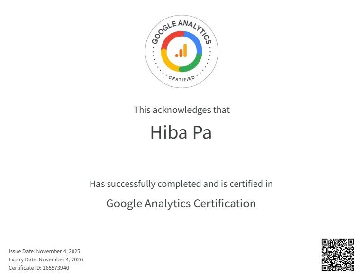 Hi, I’m Hiba, a passionate Freelance Digital Marketing Strategist in Kannur, kerala, dedicated to helping brands grow and connect with their audience . I studied digital marketing at Open Tutor Academy, Kannur, where I built a strong foundation in social media marketing, SEO, content creation, and branding.